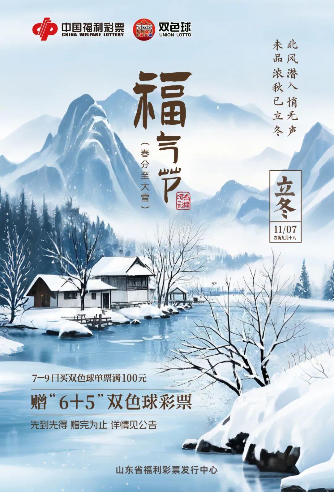 冬日初临,福气盈门。11月7日立冬节气如期而至,山东福彩“福气节”活动今日暖心开启。在这万物收藏的时节,山东福彩准备了30万元“6+5”双色球复式赠票,为这个冬日注入第一份温暖惊喜。