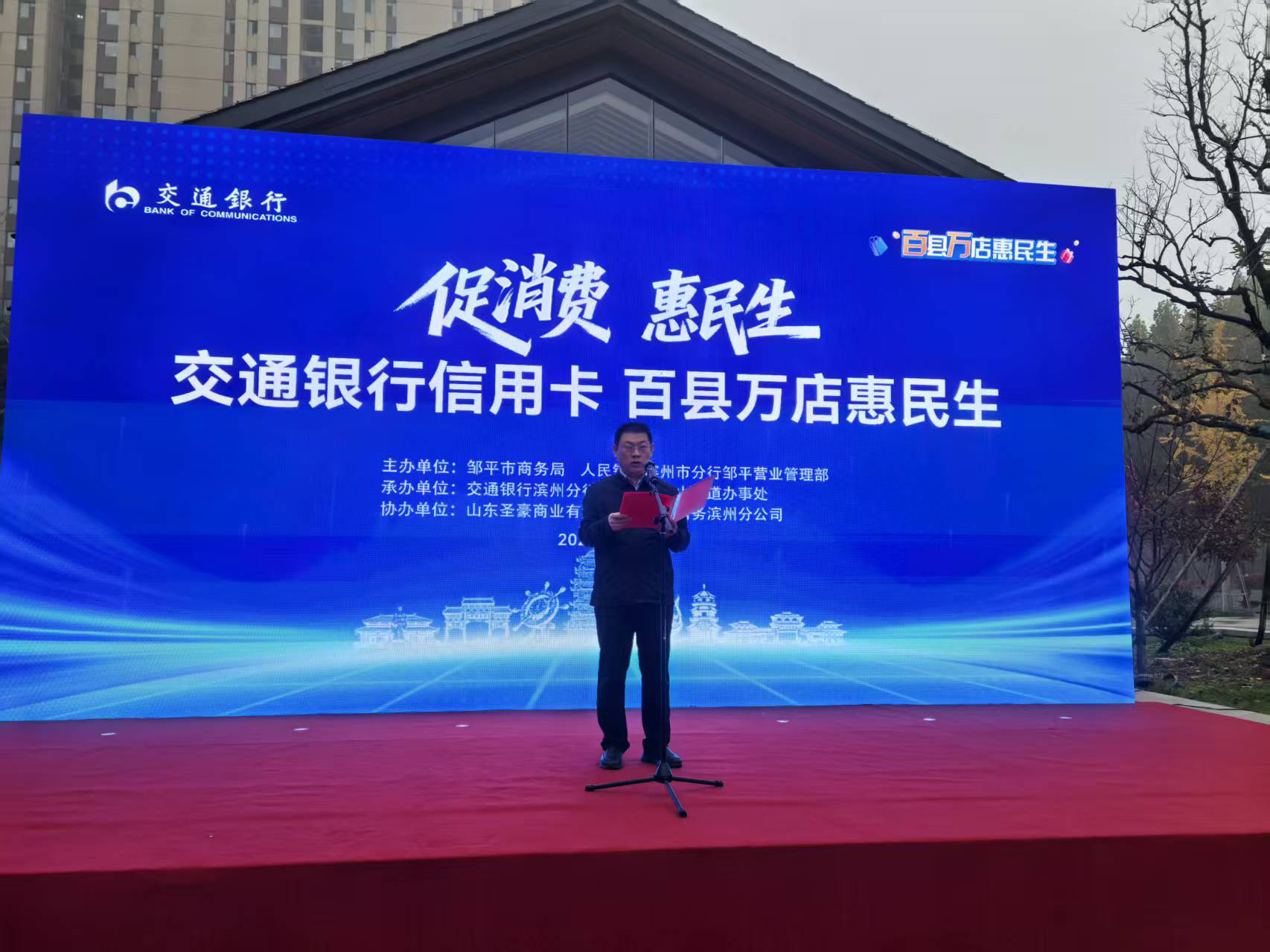 11月8日,由邹平市商务局、人民银行滨州市分行邹平营业管理部主办,交通银行滨州分行、邹平市黄山街道办事处承办,山东圣豪商业有限公司、银联商务滨州分公司协办的“促消费 惠民生——交通银行信用卡百县万店惠民生”活动在邹平市悠乐里商圈正式启动。此次活动旨在通过政银企三方合力,进一步释放消费潜力、激发市场活力,为邹平市经济高质量发展注入金融动能。