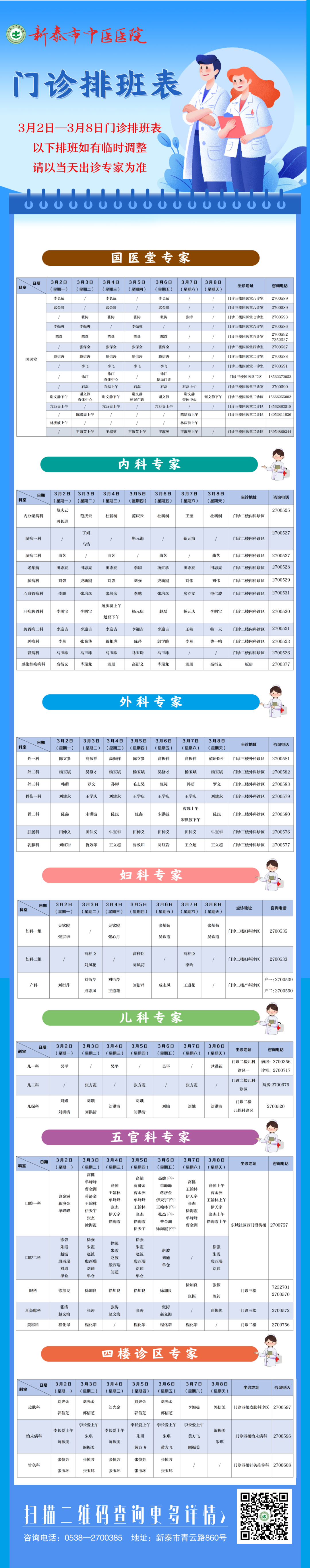 门诊排班表 温馨提示 为更好地方便广大患者就诊 现将3月2日—3月8日 门诊医师坐诊表 公布如下 请您合理安排时间咨询就诊 以下排班如有临时调整 请以当日出诊专家为准 (新泰市中医医院) (齐鲁晚报·齐鲁壹点客户端欢迎各界投稿,提供线索,包括文字、照片、短视频。泰安新闻素材请联系齐鲁晚报泰安融媒中心,热线电话:0538-6982110。)