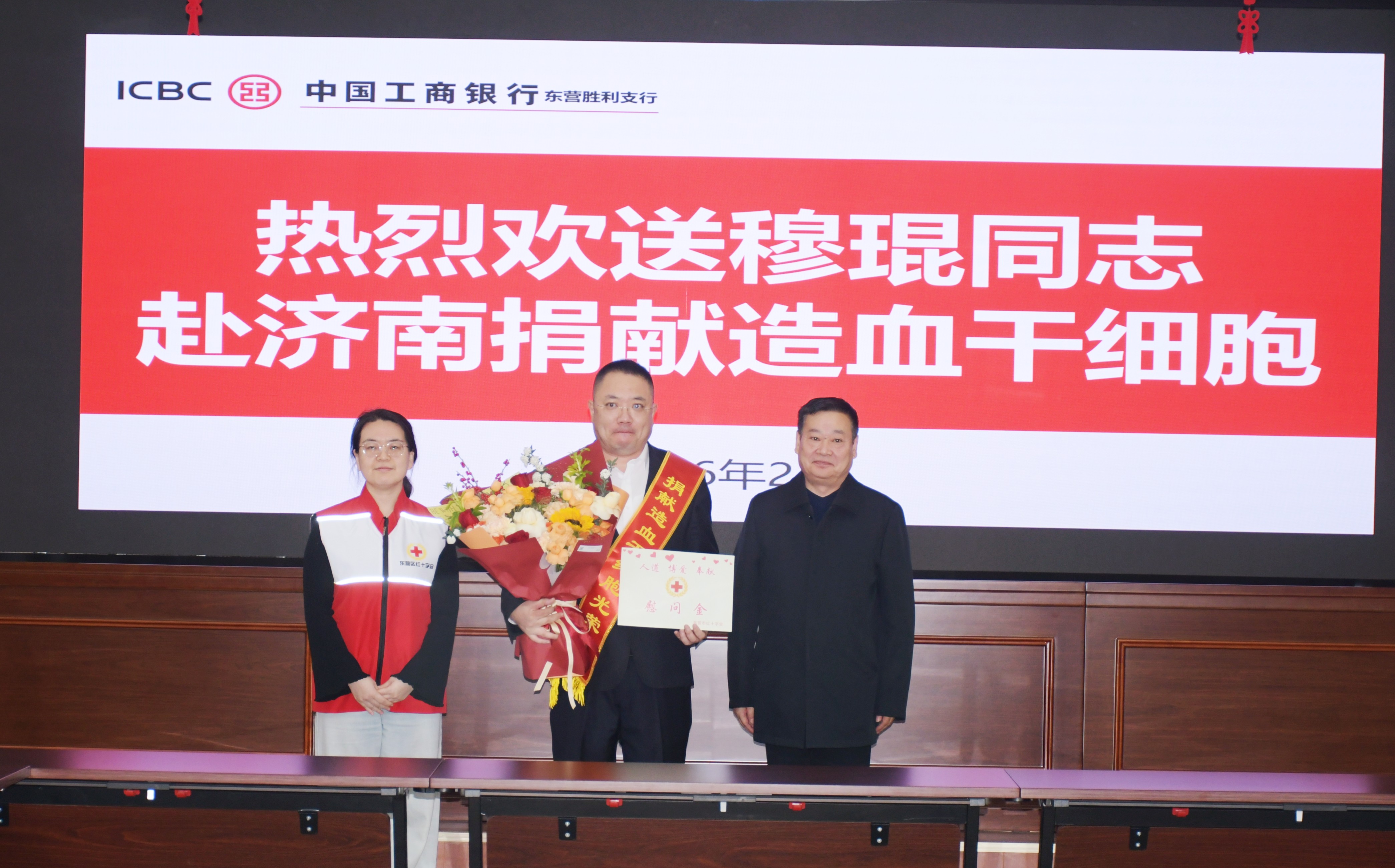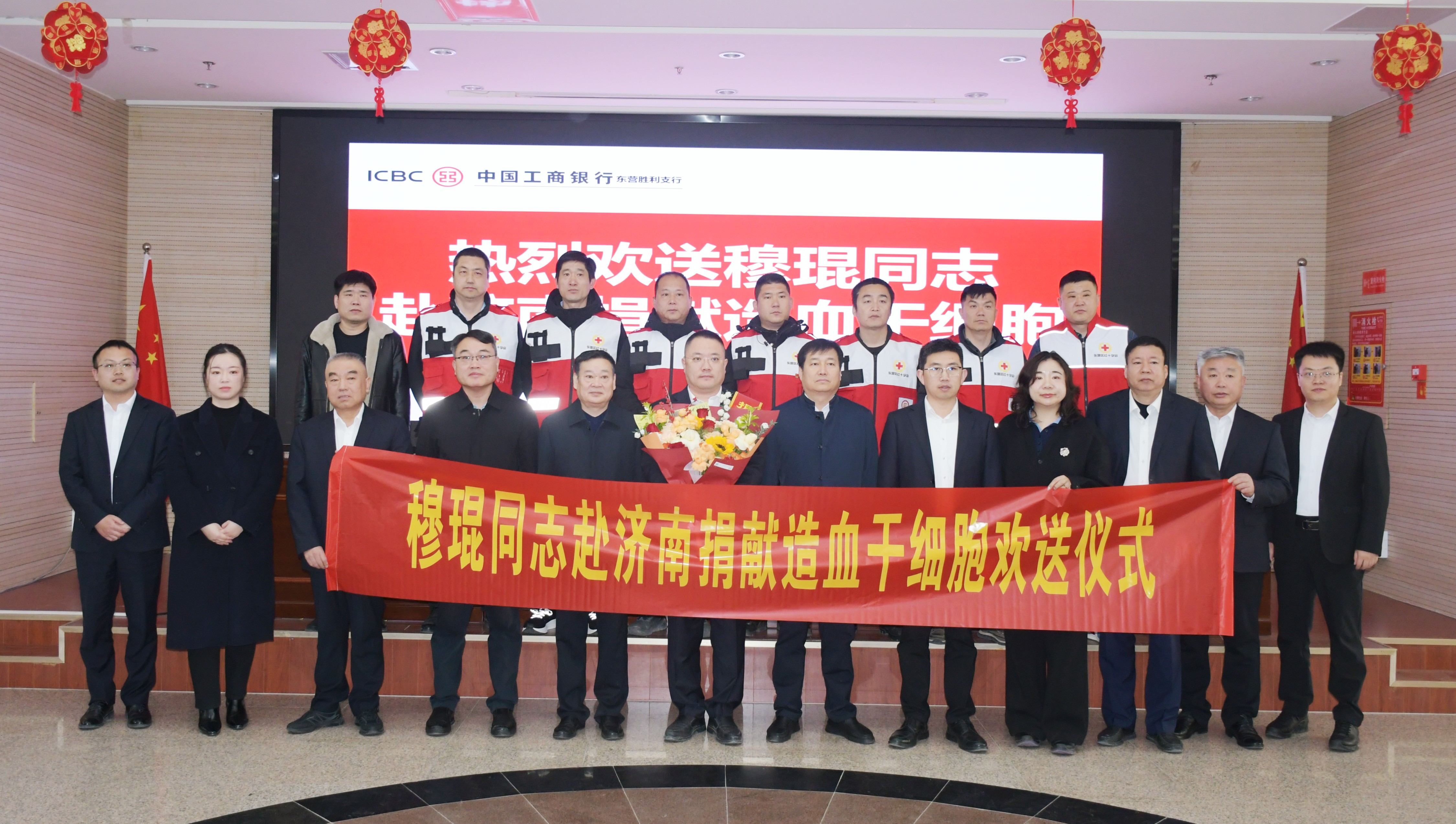 2月27日上午,东营市红十字会在中国工商银行股份有限公司东营胜利支行会议室隆重举行了穆琨赴济南捐献造血干细胞欢送仪式。市红十字会党组成员、副会长郭连玉,东营区政府党组成员、副区长李志平,工商银行东营分行工会副主席、工会办公室主任邓晓云,工商银行东营胜利支行党委书记、行长赵青海,区直相关部门分管负责同志及红十字志愿服务队代表等出席欢送仪式。