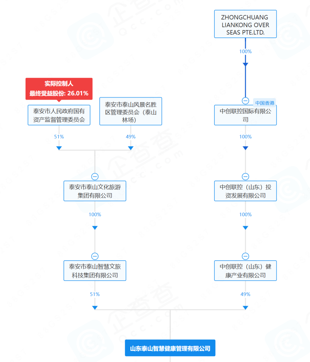 经过检索,山东泰山智慧健康管理有限公司,成立于2022年6月13日,股东为:泰安市泰山智慧文旅科技集团有限公司,持股比例51%;中创联控(山东)健康产业有限公司,持股比例49.00%。通过股权穿透来看,实际控制人为泰安市人民政府国有资产监督管理委员会。