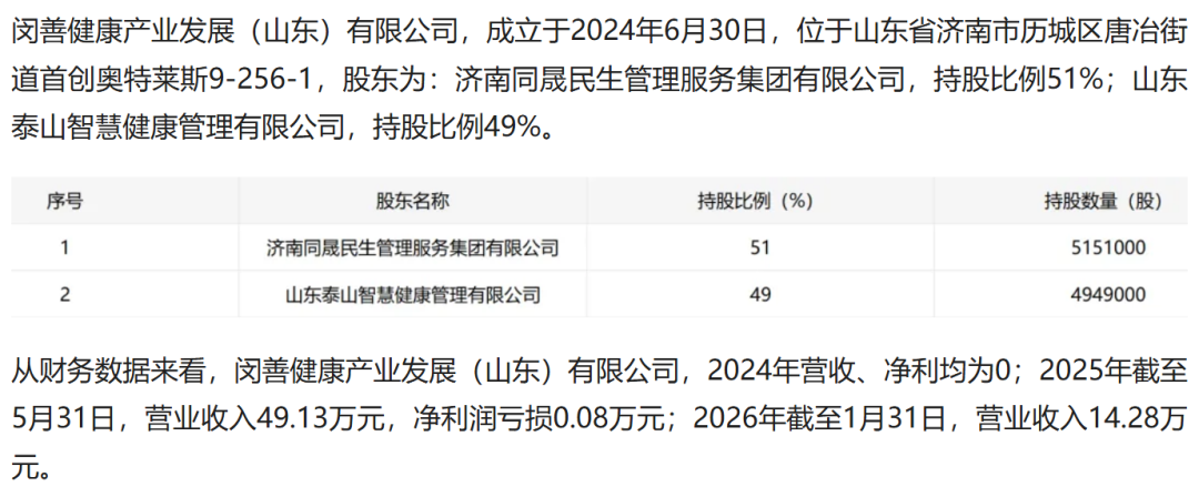 闵善健康产业发展(山东)有限公司的另一方股东,济南同晟民生管理服务集团有限公司,通过股权穿透来看,是山东历城城市发展集团有限公司的全资子公司。